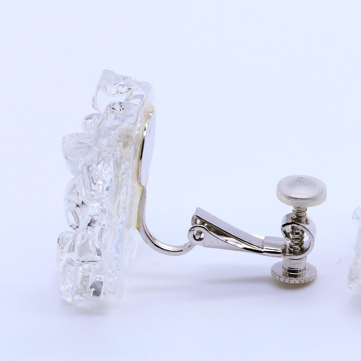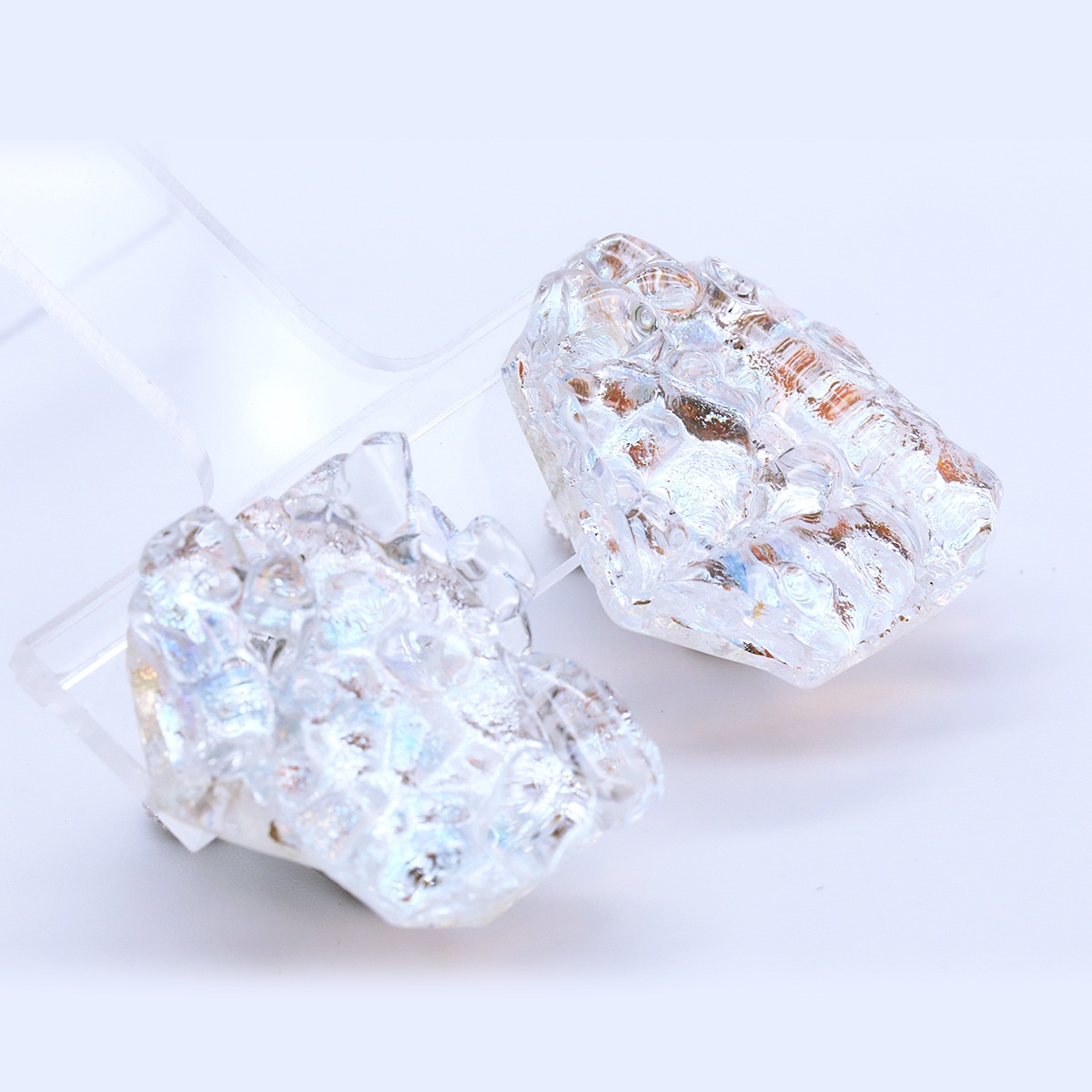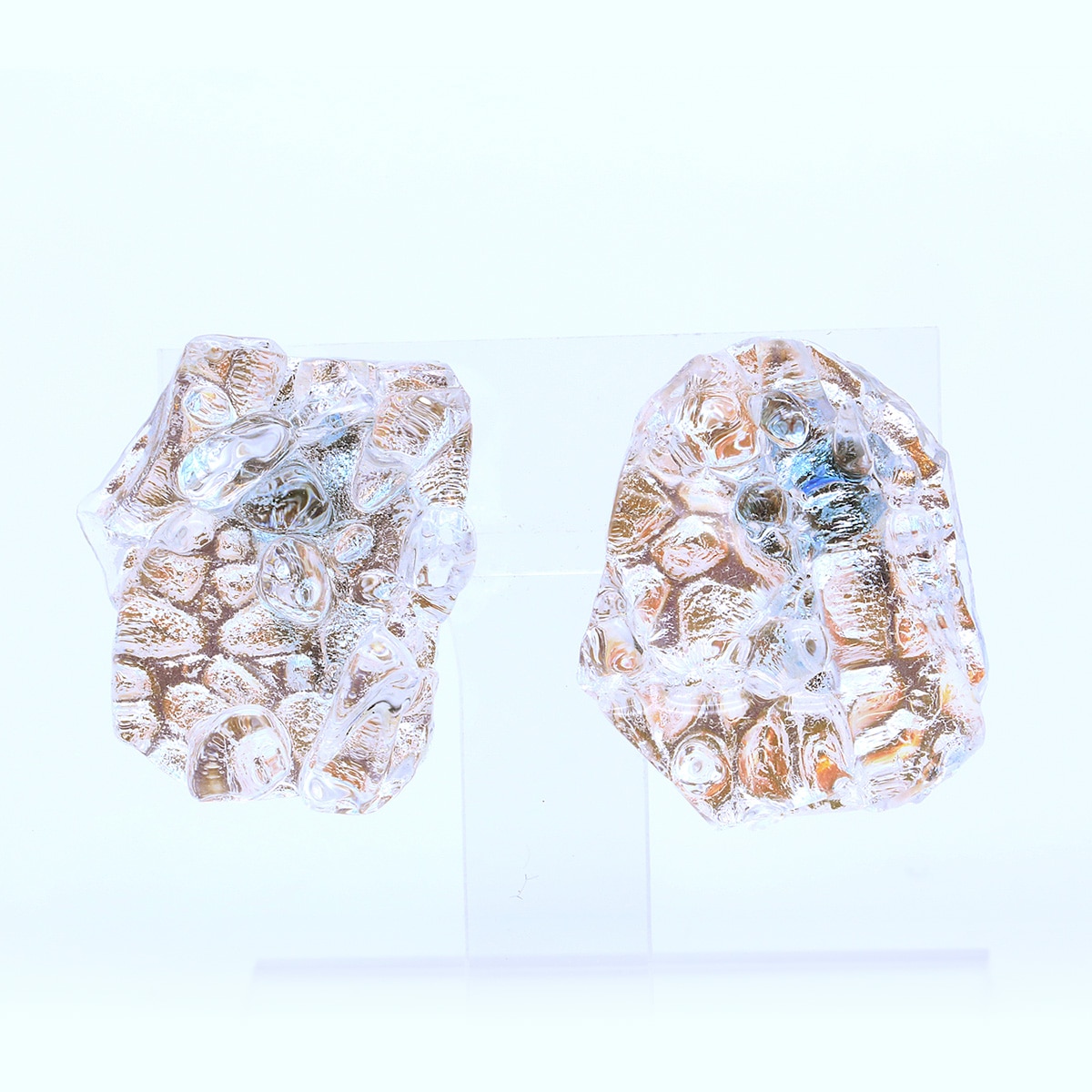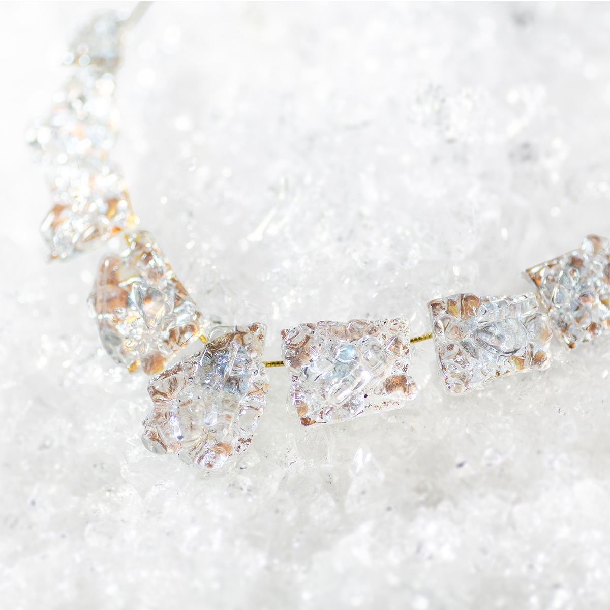 世界観を表現するために、あえてガラスの粒の質感を残して制作しています。そのため、ガラスを焼く時の温度管理が重要で難しく、電気炉の前で常に温度を気にしながらの作業です。凹凸感のあるデザインの為、よりガラスに光が反射して、着けているとキラキラと光り輝き高級感があります。