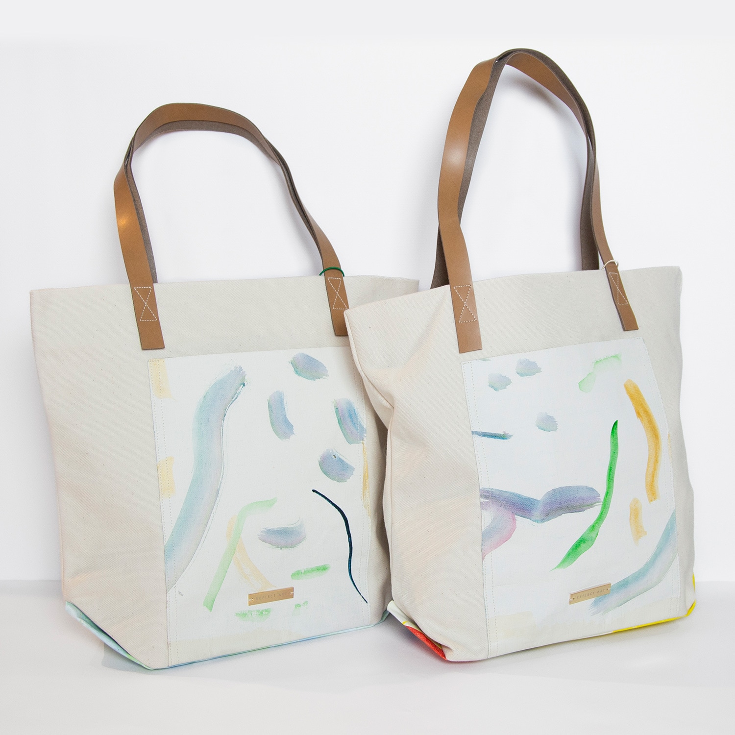 印刷ではなく手描きの柄のトートバッグ。バッグの本体は使いやすい帆布素材を使用。バッグの顔となる表部分は、絵画で使用するキャンバス布に実際に絵を描き、原画そのものを裁断・縫製して仕上げています。絵具のノリや色彩、立体感をお楽しみください。