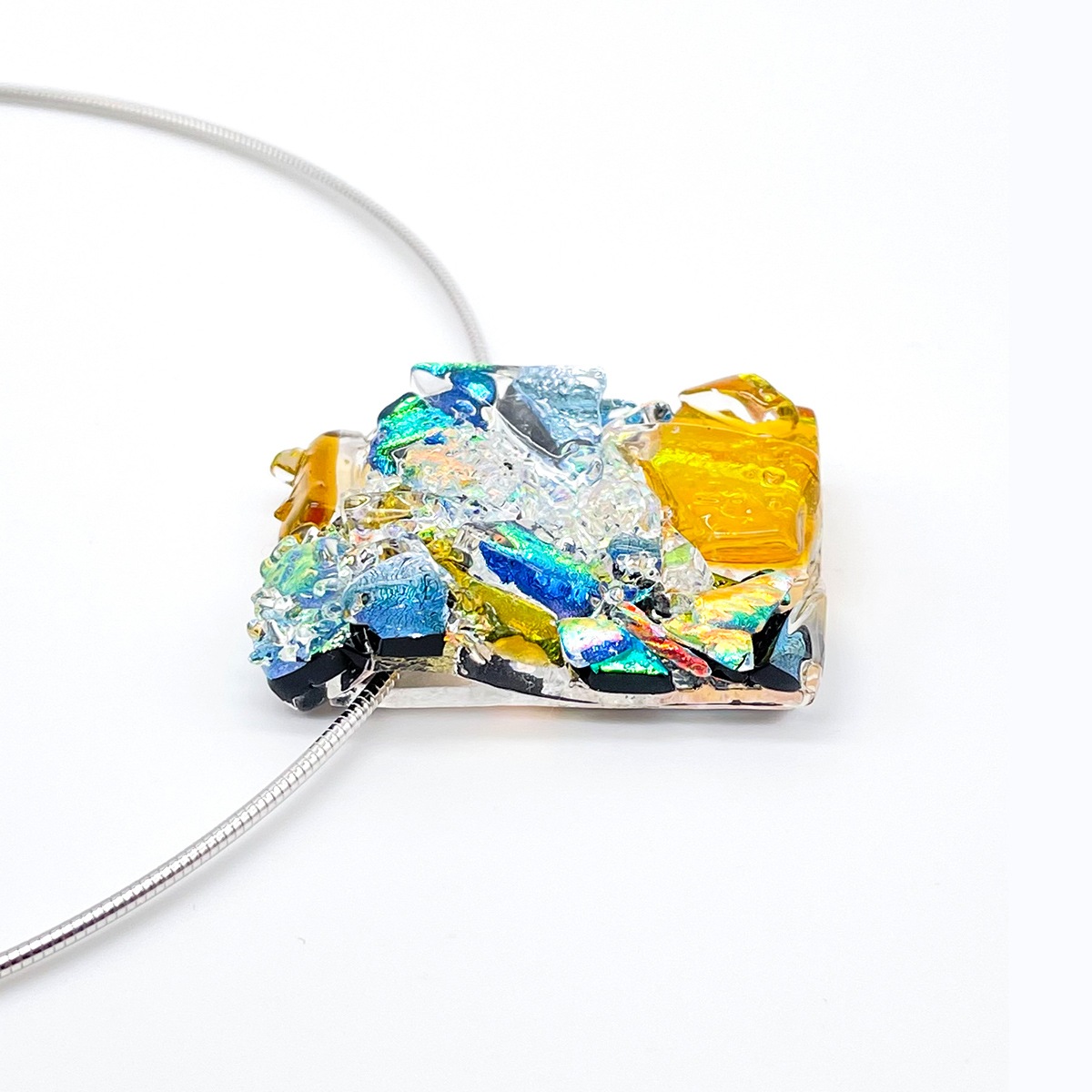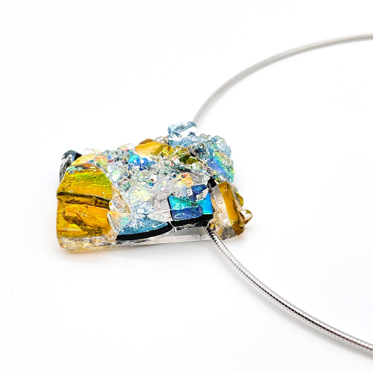 ガラスの立体感が目でも楽しめるテクスチャーシリーズのネックレスです。ゴールドをベースに数種類の割ったガラスを載せて焼き上げています。