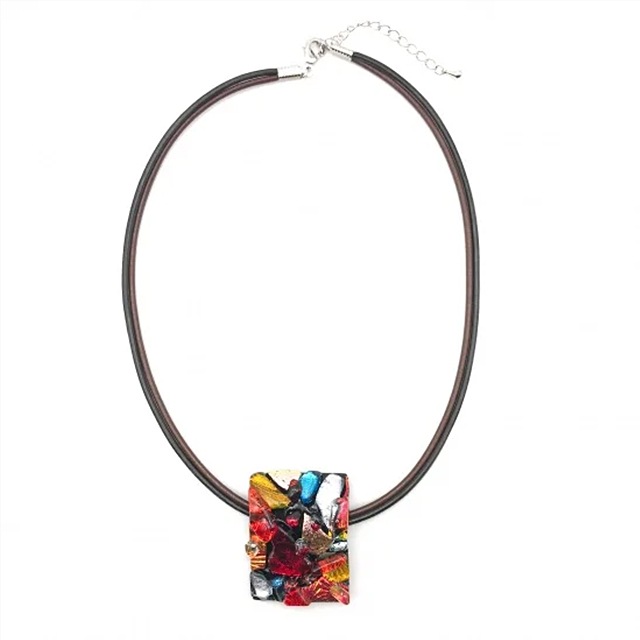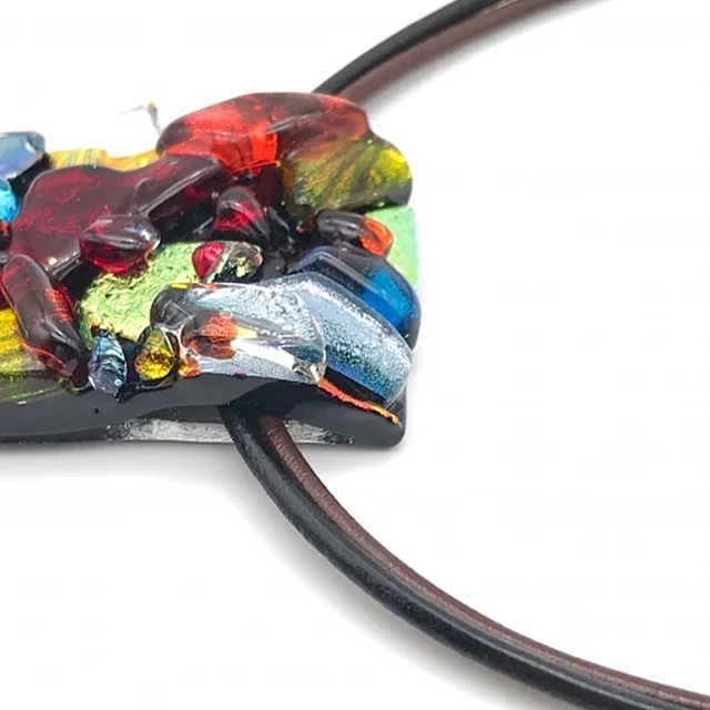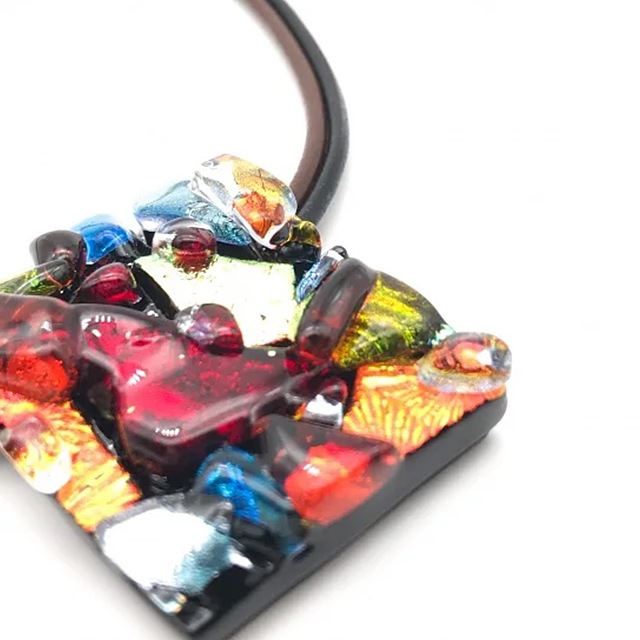 ガラスの立体感が目でも楽しめるテクスチャーシリーズ。オレンジとレッドを基調に7種類もの割ったガラスを載せることにより、動きのある柄になっている。温かみのある色味と手作りの優しさを感じるデザインは、華美になりすぎず、落ち着いた印象で胸元を飾ります。